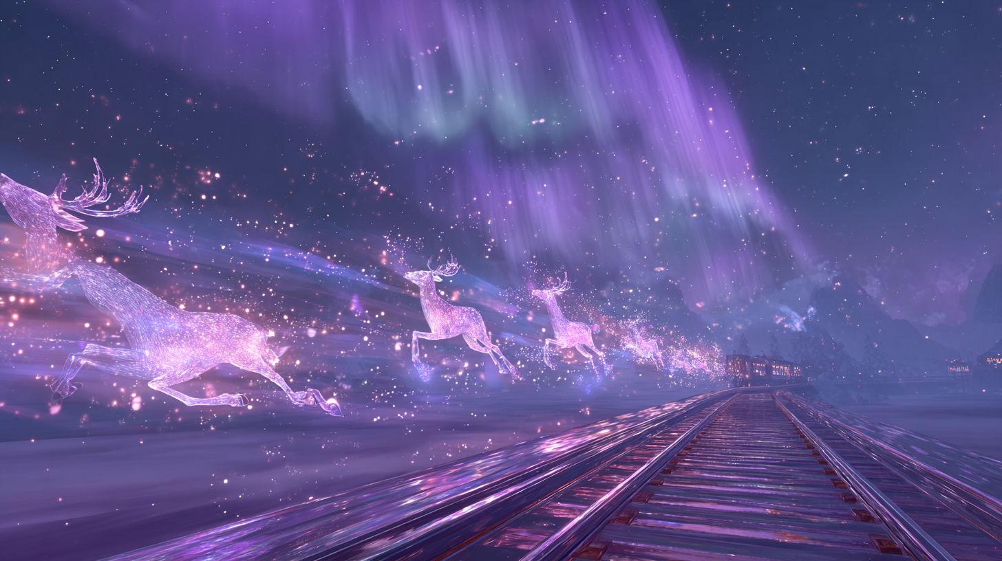 결과는 정말 충격적이었습니다. 형체는 유지하되 빛으로만 이루어진 사슴들이 보라색과 분홍색 오로라 아래에서 공중을 질주하는 모습은 그야말로 '상상 초월'이었습니다.