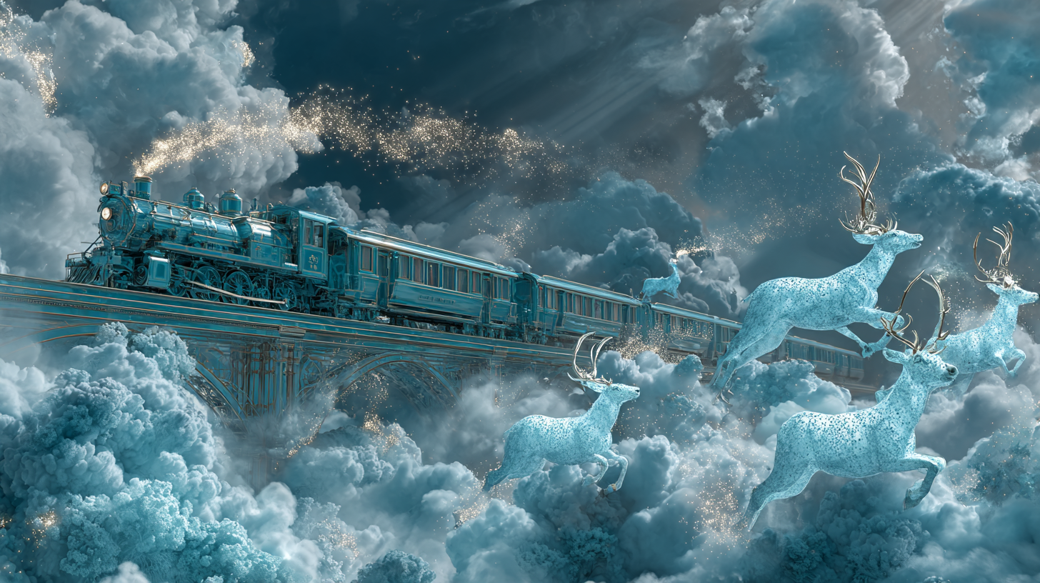 /imagine prompt: A majestic train soaring through a dark, starry night sky above a sea of clouds. The sky is illuminated by a breathtaking aurora borealis in vibrant purple and pink hues. The train track is made of glowing crystal. Spectral deer, made almost entirely of radiant, intense light with discernible forms, are flying and galloping through the air, emitting brilliant trails of energetic glow and shimmering stardust. Fantasy, hyper-detailed, cinematic lighting emphasizing the aurora and luminous creatures, epic scale --ar 16:9